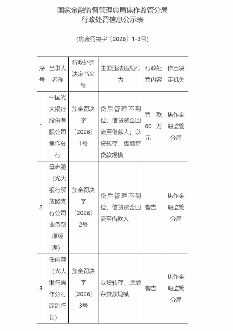 1月23日,国家金融监督管理总局焦作监管分局行政处罚信息公示表显示,中国光大银行股份有限公司焦作分行,贷后管理不到位,信贷资金回流至借款人;以贷转存,虚增存贷款规模,被罚款60万元。